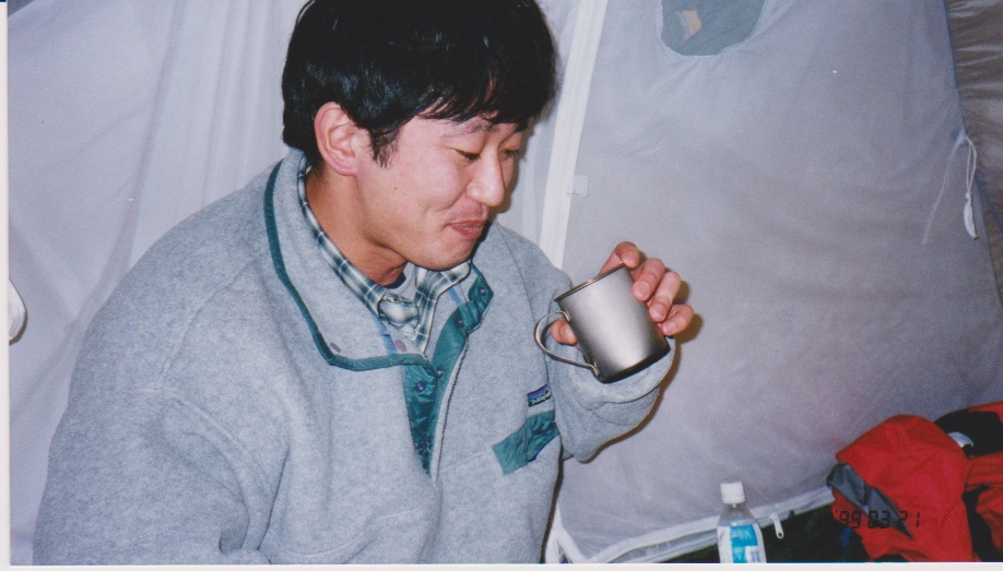 降ったばかりのふわふわの雪を整地してテントを張った。早速ビールを飲み始めた。