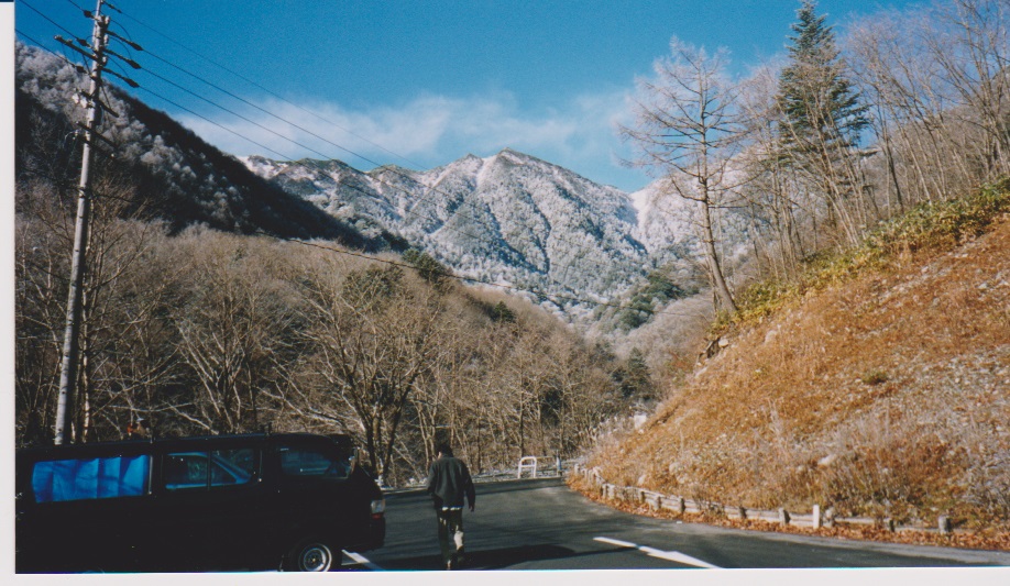 駐車場の水場は凍結していた。駐車場からは下の写真のようにうっすらと雪化粧をした蝶が岳方面が望めた。