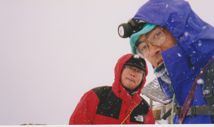 悪天候の中の登頂なので喜びもひとしおだった。眺望は全く得られなかった。