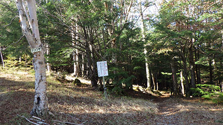 | アコウ平は車が5−6台駐車できるスペースがあるが、平日にもかかわらず、既に2台駐車してあった。 立ち木に「アコウ平」と書かれた小さな札がかかっており、わきには「金峰山」と書かれた標識も立っていた。そこに登山口がある。 8:45ころ出発した。車の温度計は3℃まで下がっていた。ここの標高は1960メートルだ。 |