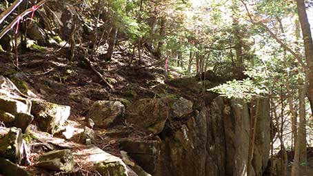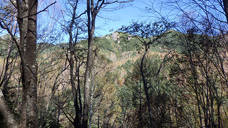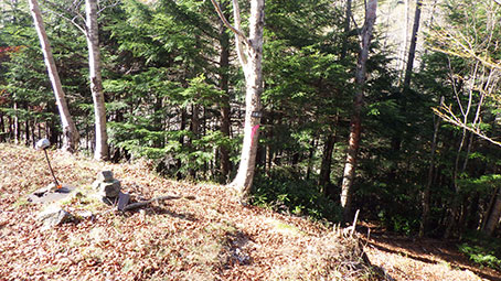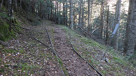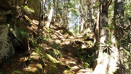| 登山道は、樹林帯の斜面につけられており、倒木を跨いだりしながら降りていく。 林業に使われた軌道の跡のようなものがあった。しばらくトロッコも走れただろうと思える道が続いた。 途中、林の間から金峰山の頂上方面が望めるところがあった。 |
