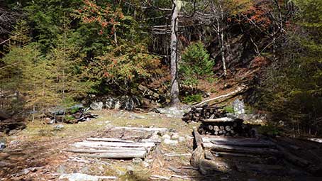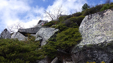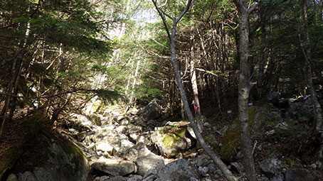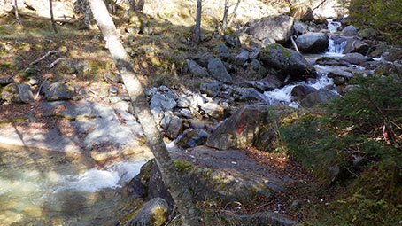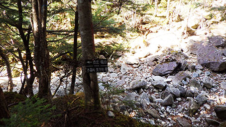 | 登山道が沢に突き当たったところには赤ペンキで矢印が下向きに書かれており”↓ ”となりに何か書いてあったが良くわからなかった。 元気な人ならひとつ飛びで渡れるだろうが、つま先を痛めそうなので、少し下流を探った。 するとロープが渡してあるところがあり、流れの岩の間には細い木が3本横たえてあった。 乗って渡れるほどしっかりしたものには見えなかったが、試しに乗ってみると、意外に大丈夫で、渡ることが出来た。 ネット上では靴を脱いで渡渉している記録が散見された。 |