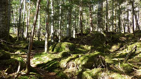 | 少し歩くと、御室小屋跡に到着する。数年前までは壊れた小屋があったようだが、この時はもう、きれいに片付けられていた。 小屋の裏手から、急に傾斜がきつくなる。地形図の1950メートルあたりで等高線が急に密になるところだと思う。 ここまで来てようやく、出発地点のアコウ平と同じ標高に戻ったことになる。 |