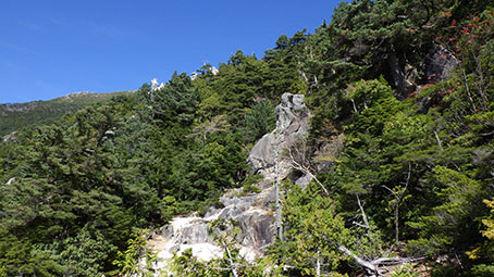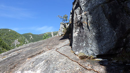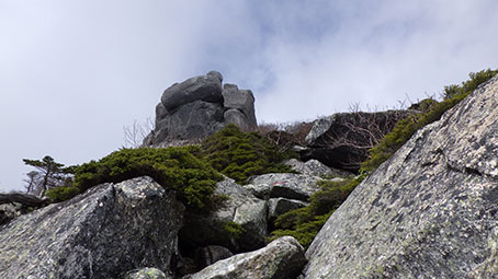| 一枚岩の岩盤を登っていくところがある。2010メートル 9:58 傾斜はきつくはないが、外傾していていやらしい。しっかりした鎖がついているのでこれにお世話になる。 岩は乾いていたので良かったが、濡れていることもあるらしい。凍結しているとゾッとする。 このスラブを登ると頂上方面が望めて、隻手廻し岩と五丈岩が見える。 |