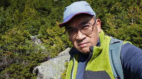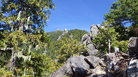 | 所々で五丈岩が望める。この日は割と寒かったので、長袖のシャツの上にフリースのベストを着ている。 | |