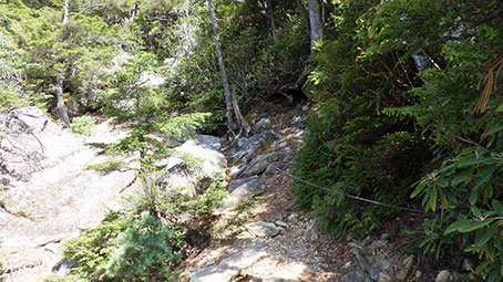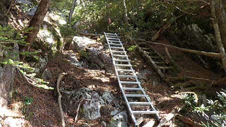| 傾斜がゆるく普通の登山道が付いているところはホットするが、また急な斜面に梯子がついていた。隣には古い木製の梯子があった。 | |