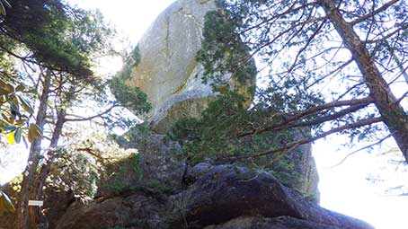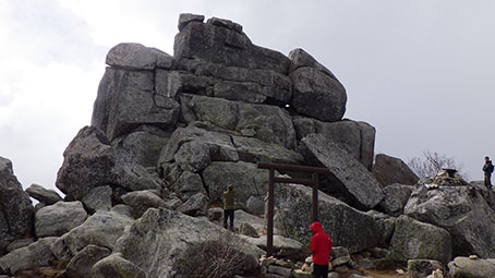 | 五丈岩の下には黒平方面を指す標識が立っていた | 五丈岩の周りには数人がいて、五丈岩に登ろうとしているようだった。 |