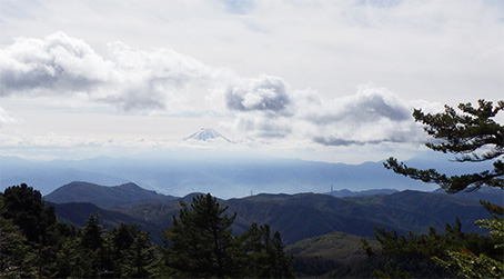 赤いリボンが随所につけられており、迷うことはないと思う。 崩落して崖になっているところにはトラロープがつけられていた。 後ろをふりむくと富士山が見えていたが、段々雲が多くなってきていた。 |