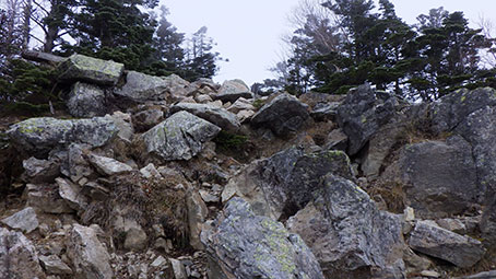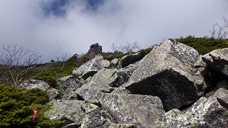 五丈岩から少し登ると山頂標識がある。2599メートル 金峰山頂は6回目で、寒かったので岩陰で合羽の上着を着た。 はじめは、登路をそのまま下りようと思っていたが、 歩きにくいルートなので、遠回りにはなるが、大弛峠経由で帰ろうと思った。 大弛峠までは途中朝日岳の登り返しがあるが、 表参道ルートの最後にある150メートルの登り返しよりは良いだろうと思った。 左は朝日岳の頂上直下の登り。 朝日岳は2579メートル。 朝日岳の後に朝日峠というのがあり、そのあとも小さい起伏が何度もあり なかなか高度が2400から下がらなかった。 アコウ平へ降りるつもりだったので、 持ってきた地図は大弛峠が出ておらず 大弛峠の標高が2360メートルもあることを忘れていた。 金峰山から約2時間で大弛峠に到着した。 途中、私よりも高齢と思われる数人を追い越し、 若い1人に追い抜かされた。 |
