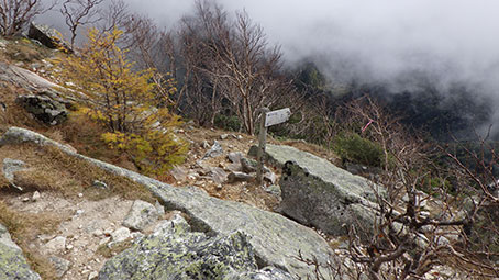 軌道跡のトラバース道から沢に降りる部分には目印がついている。 一旦1800メートルまで降りる。 |