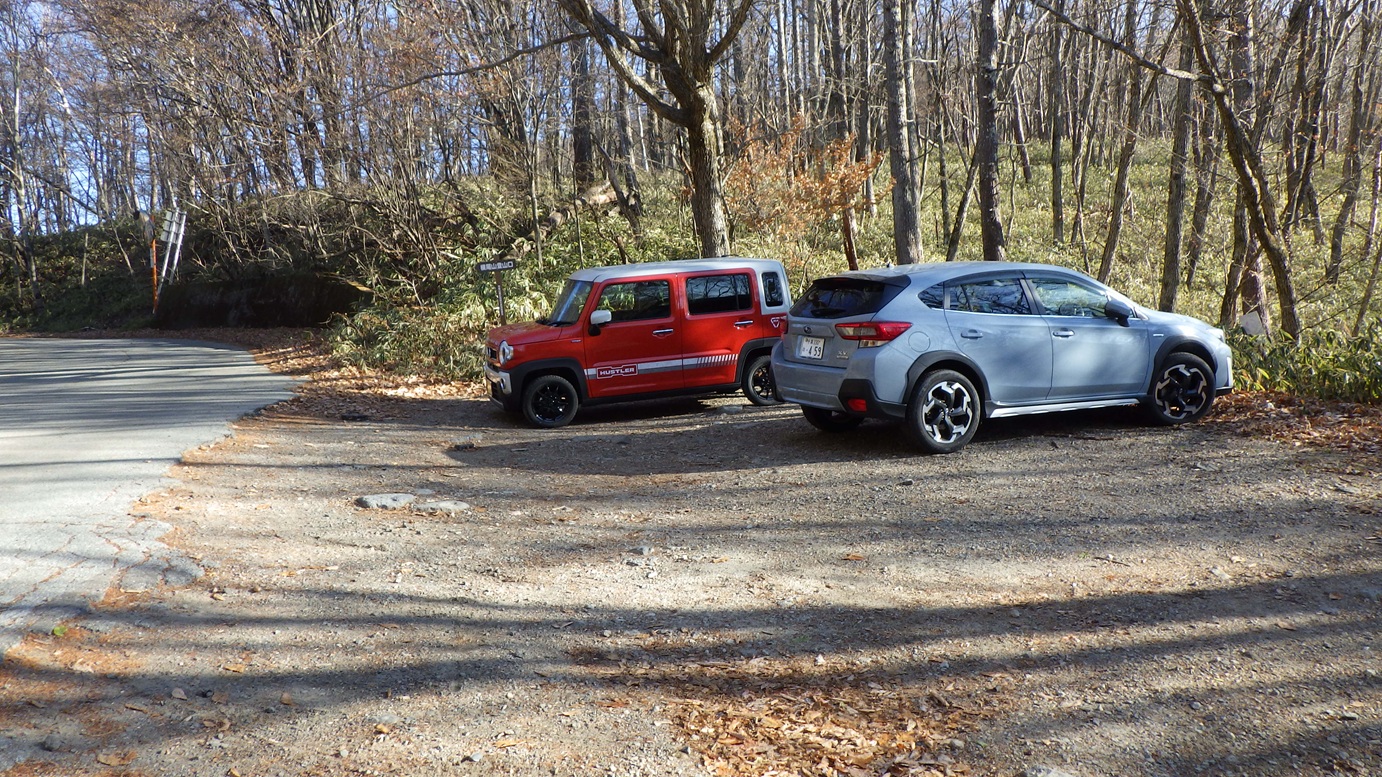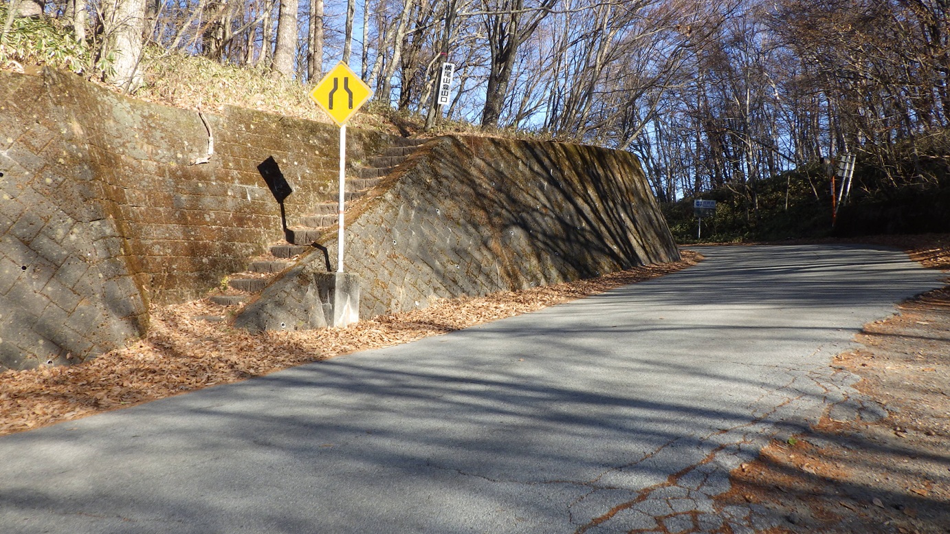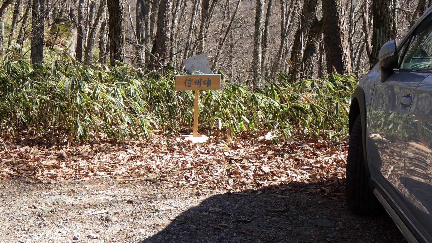 信州峠には駐車場があり、9時ごろ私が付いた時には 1台とまっていた。 気温は1℃くらいだった。 ズボンは薄手のものだったが、薄いタイツを履いていたので 寒くはなかった。 |