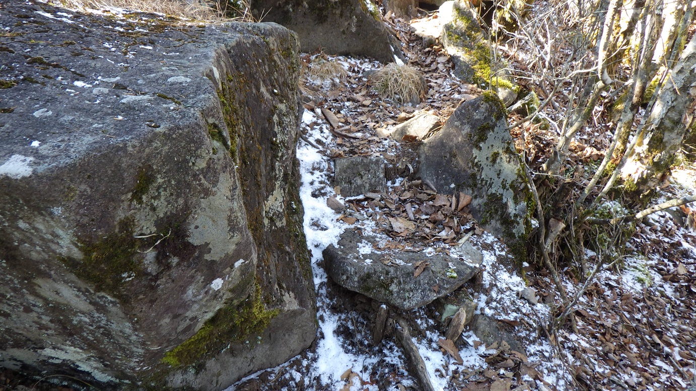 カヤトの原で頂上方面からおりてくる2人組と会った。 駐車場に停まっていた車の主で夫婦と思われた。 カヤトの原から頂上までは小さい起伏があった。 登山道には霙が降った跡が残っていた。 |