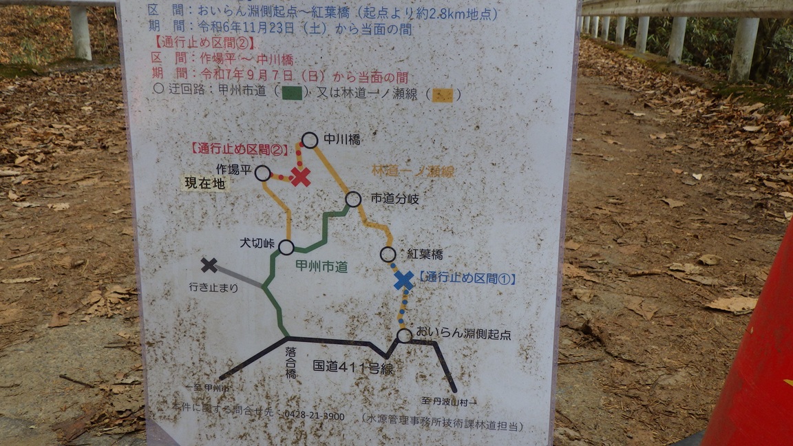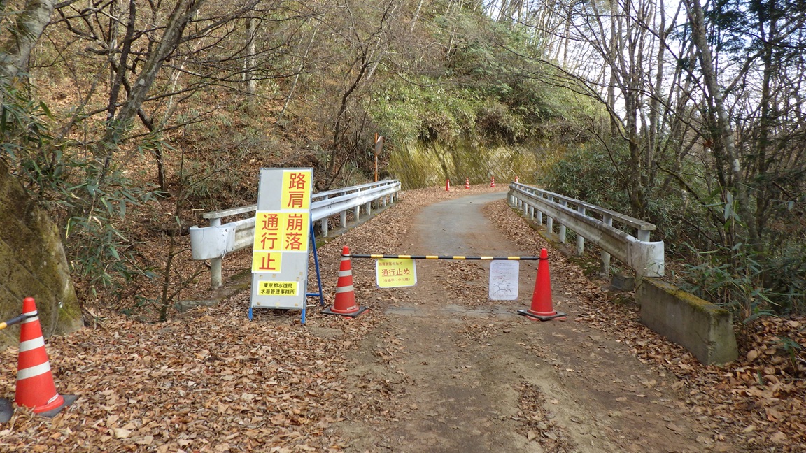 自宅を8:30頃でて、青梅街道を辿り林道一ノ瀬線の入口に着いたら、林道が路肩崩落のため通行止めになっていた。